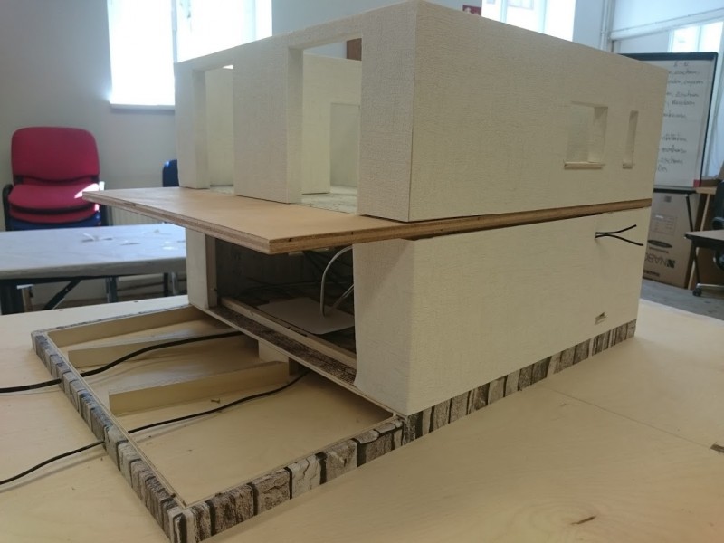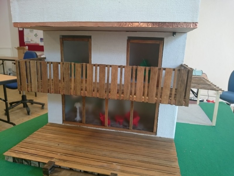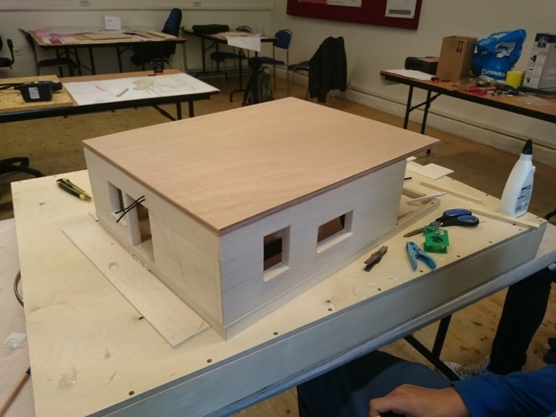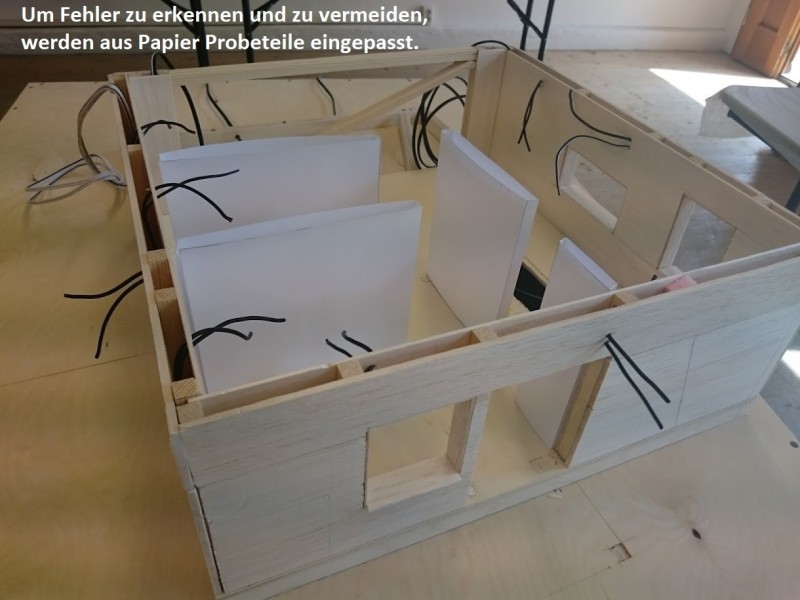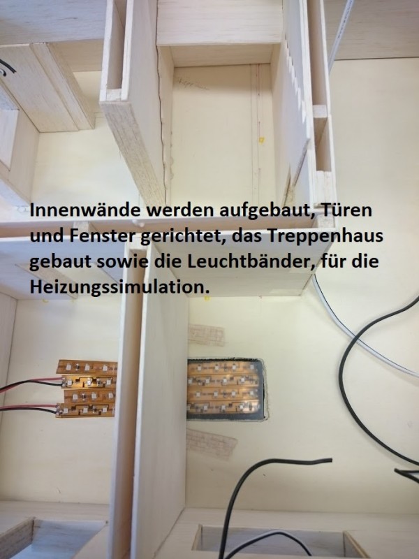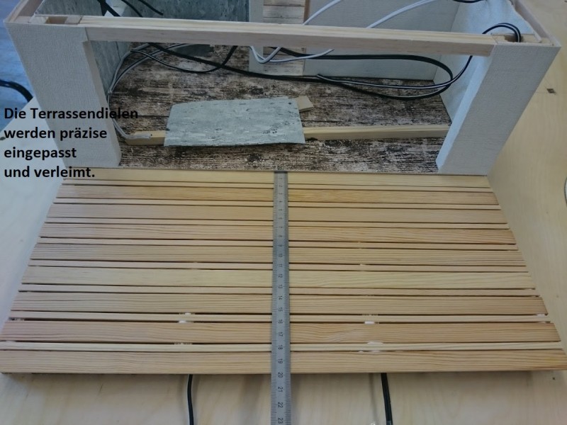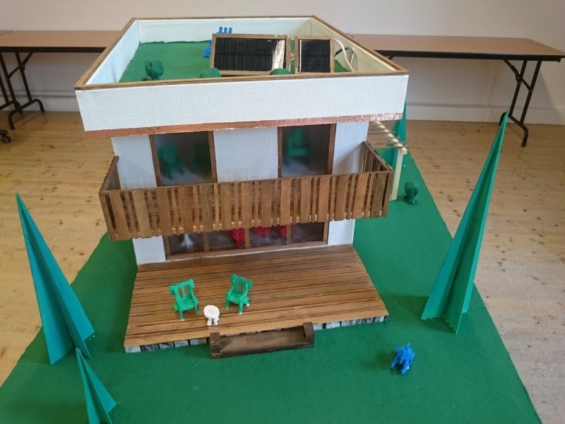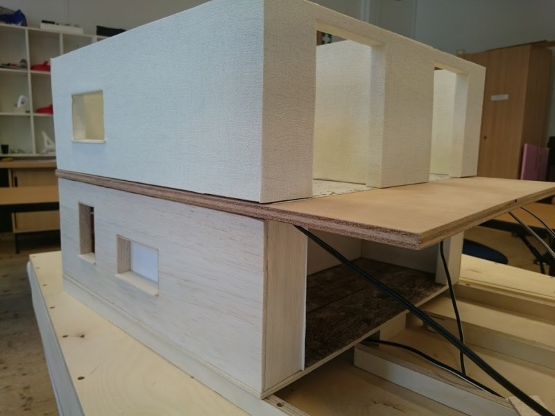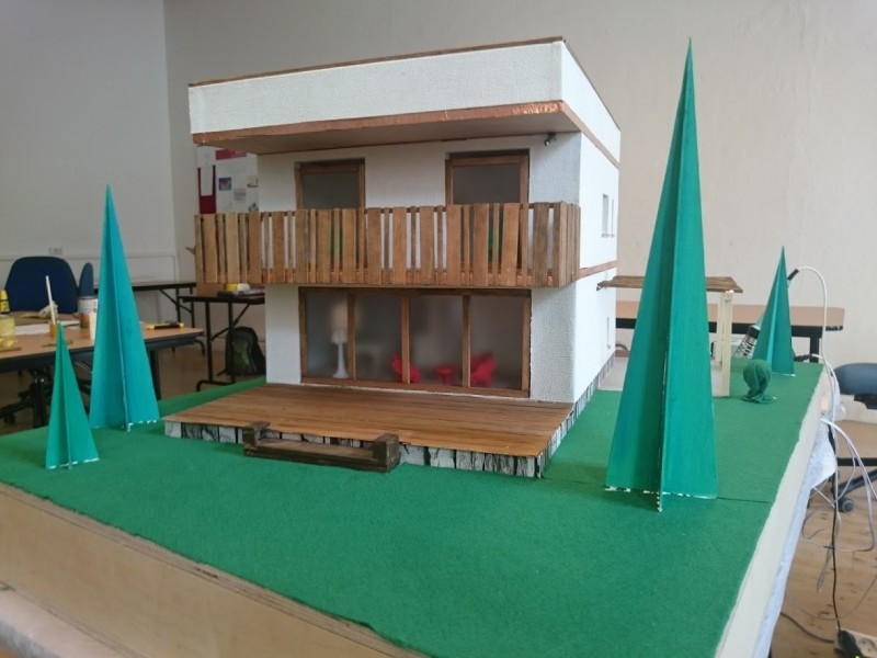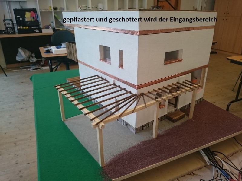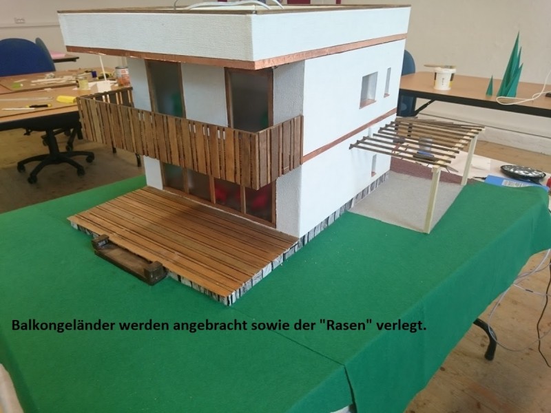Zuerst wurde ein Sockel gebaut der einerseits den Boden und Keller darstellt und andererseits in einer Lade die Elektronik für Beleuchtung und Simulation bergen soll. Aus verschieden starken Balsahölzern wurden im Anschluss die Außen und Innenwände hergestellt wobei parallel die Verkabelung für die spätere Beleuchtung und die Versorgung mit einbezogen werden musste. Nach der Errichtung der ersten Decke wurde das zweite Geschoß errichtet und anschließend die Attika welche auch die Module der Photovoltaikanlage trägt. Der Außenbereich wurde begrünt und gepflastert um dem Modell ein realistisches Umfeld zu geben. Abgerundet wurde es durch kleine Möbel sowie einer aufwändig gearbeiteten Pergola.