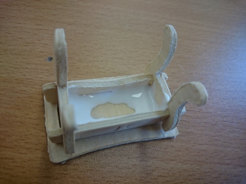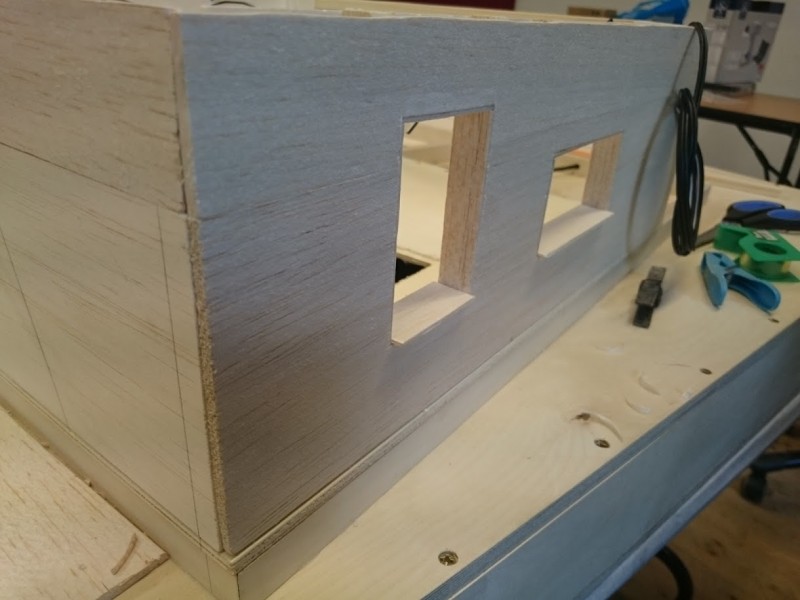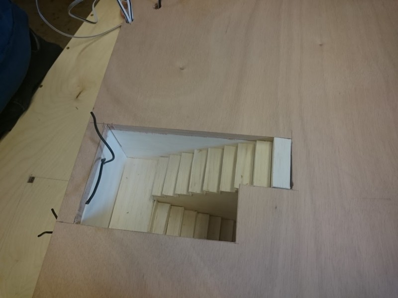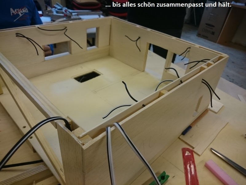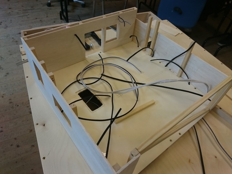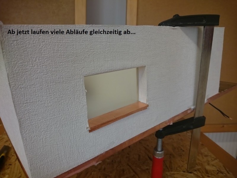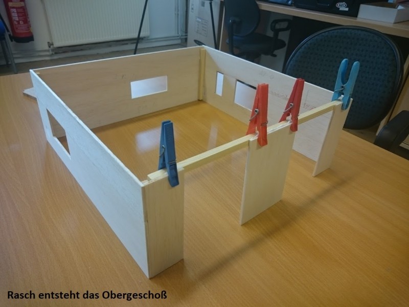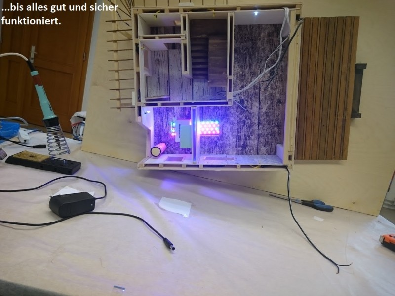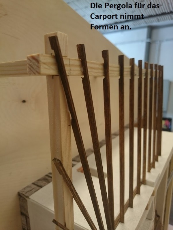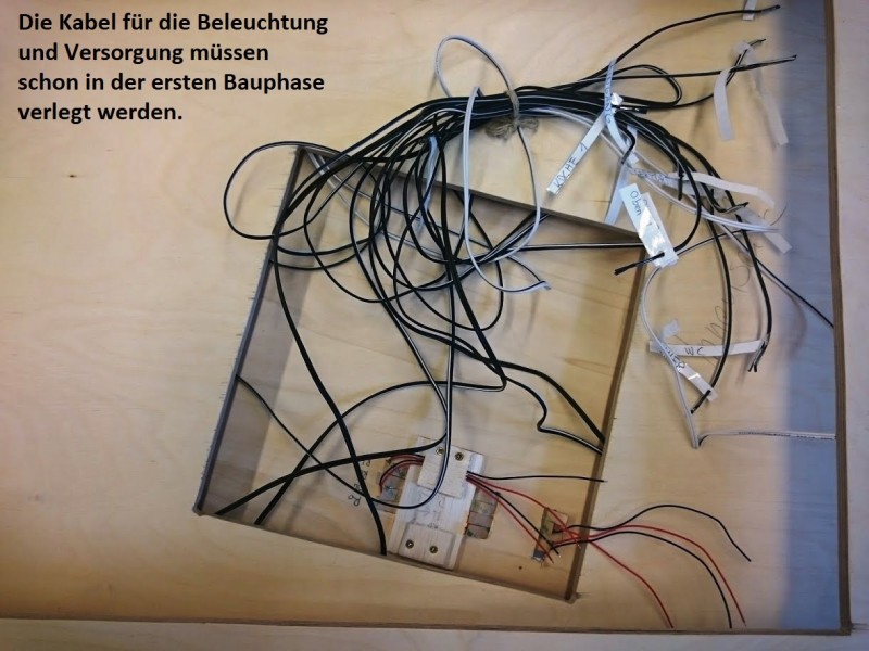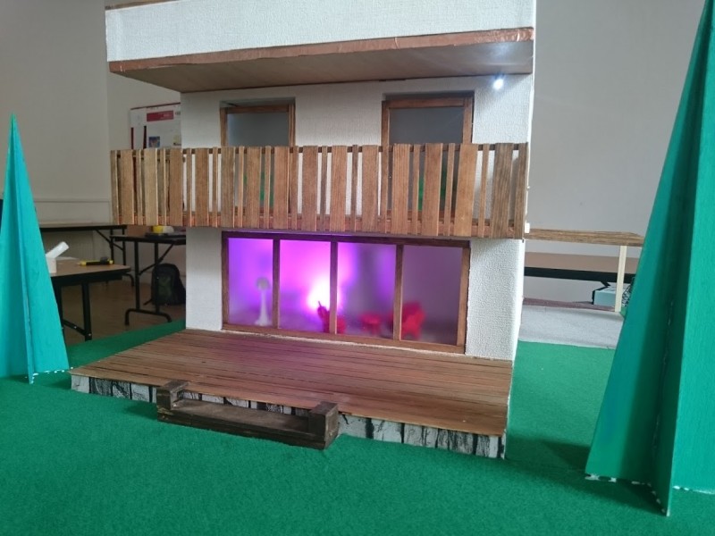 Zuerst wurde ein Sockel gebaut der einerseits den Boden und Keller darstellt und andererseits in einer Lade die Elektronik für Beleuchtung und Simulation bergen soll. Aus verschieden starken Balsahölzern wurden im Anschluss die Außen und Innenwände hergestellt wobei parallel die Verkabelung für die spätere Beleuchtung und die Versorgung mit einbezogen werden musste. Nach der Errichtung der ersten Decke wurde das zweite Geschoß errichtet und anschließend die Attika welche auch die Module der Photovoltaikanlage trägt. Der Außenbereich wurde begrünt und gepflastert um dem Modell ein realistisches Umfeld zu geben. Abgerundet wurde es durch kleine Möbel sowie einer aufwändig gearbeiteten Pergola.